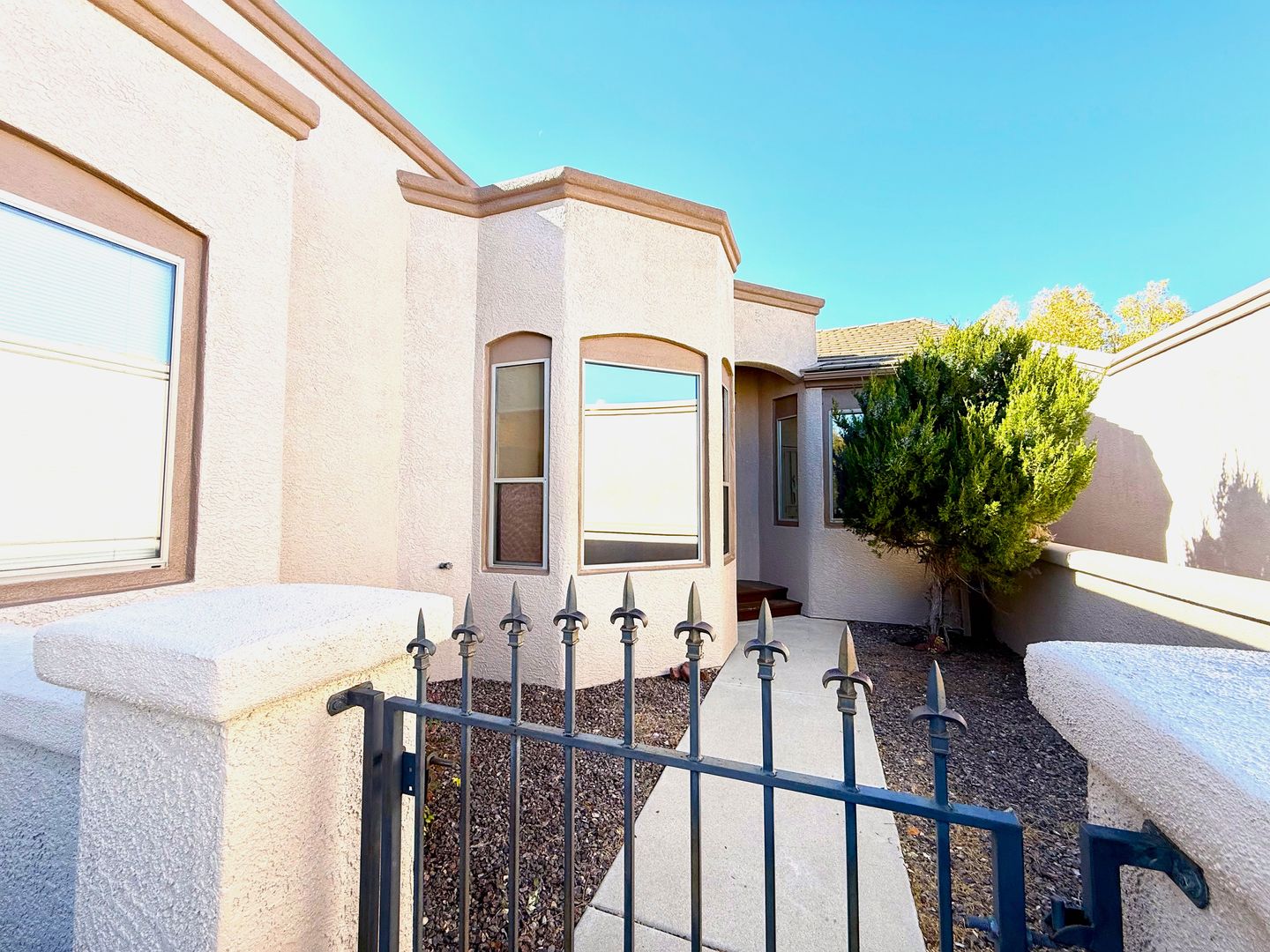 Welcome to a home that offers both simplicity and serenity in one of Prescott's most convenient locations. Tucked behind a private, gated courtyard, this residence immediately sets a calm and welcoming tone. Step inside and you'll find a bright, comfortable layout featuring a spacious breakfast nook and a gas fireplace that brings warmth and character to the main living area. The floorplan offers excellent functionality, with two inviting bedrooms thoughtfully separated for privacy. The guest suite provides its own bathroom, making it ideal for visitors or multigenerational living. A generously sized laundry room enhances the home's livability, and fresh interior paint gives every room a crisp, refreshed look. The primary suite is designed for comfort, offering direct access to the back patio, a relaxing garden tub and shower, and a spacious walk-in closet with plenty of storage options. A two-car garage equipped with built-in shelving and cabinets ensures there's room for tools, seasonal items, and more—keeping everything neatly organized. Outdoor enjoyment is easy here. The covered back patio overlooks a tranquil seasonal creek, creating a peaceful spot for morning coffee or quiet evenings. With front yard landscaping handled by the HOA, maintaining great curb appeal is effortless. Positioned just minutes from Prescott's shopping, dining, and recreational amenities, this home provides a fantastic blend of convenience, comfort, and low-maintenance living.